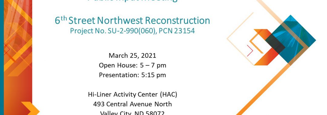 To discuss the proposed road reconstruction project along 6th St NW, from 5th Ave NW to Central Ave N, in Valley City, North Dakota. The proposed project would consist of roadway reconstruction, including hot mix asphalt surfacing; curb and gutter; sidewalk and Americans with Disability Act improvements; decorative lighting; and storm sewer, water main, and sanitary sewer improvements.